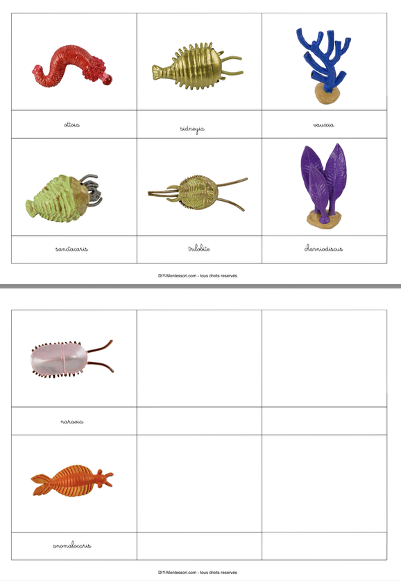 Ce document propose une série de cartes de nomenclature Montessori sur les animaux du Cambrien