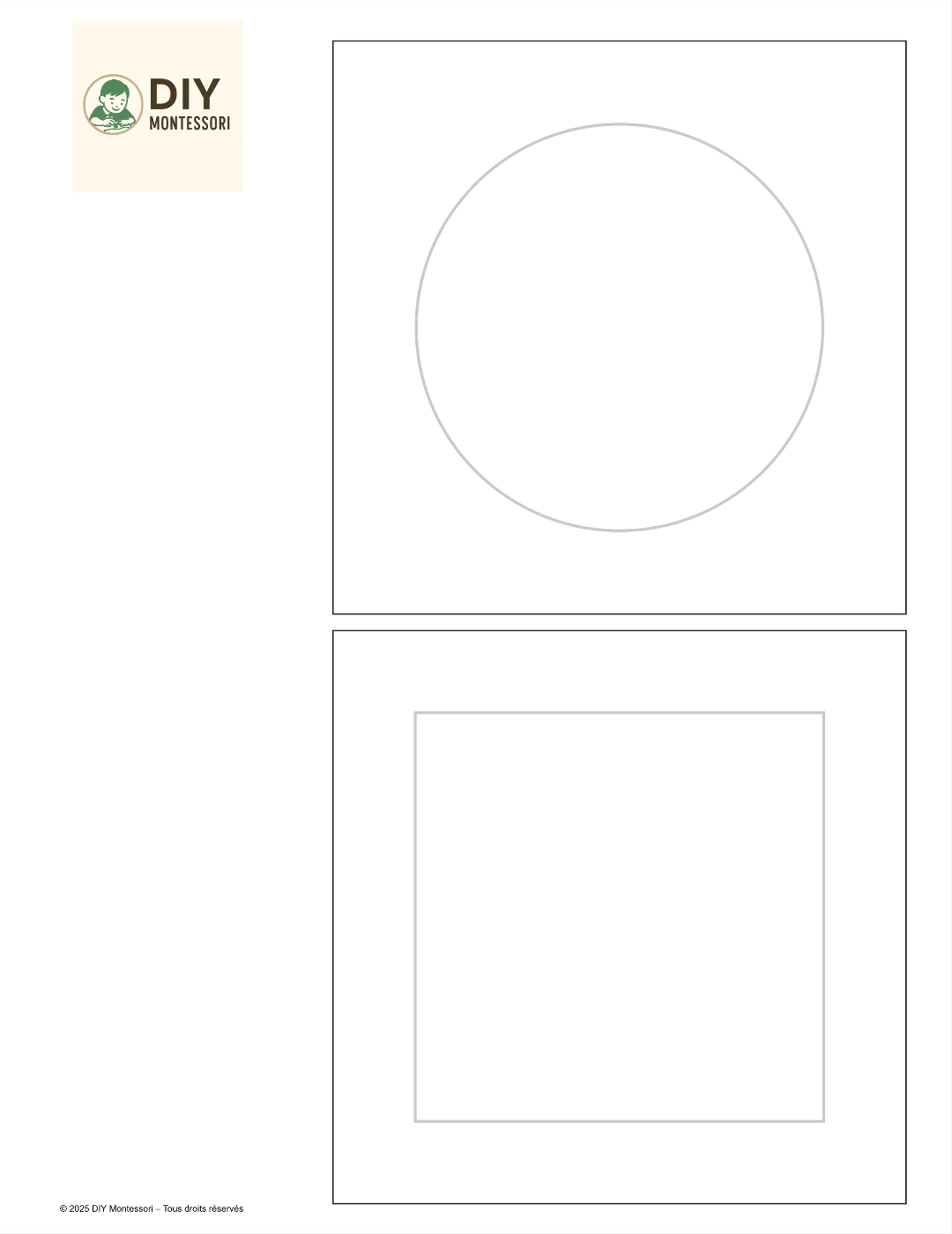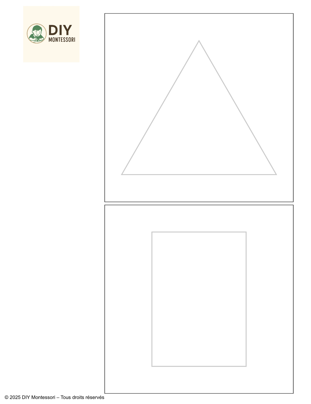 Chaque page contient 2 formes en grand format, à imprimer en noir et blanc. L’adulte peut ensuite découper, tracer et reproduire ces formes sur bois, carton ou autre support pour fabriquer un matériel personnalisé.