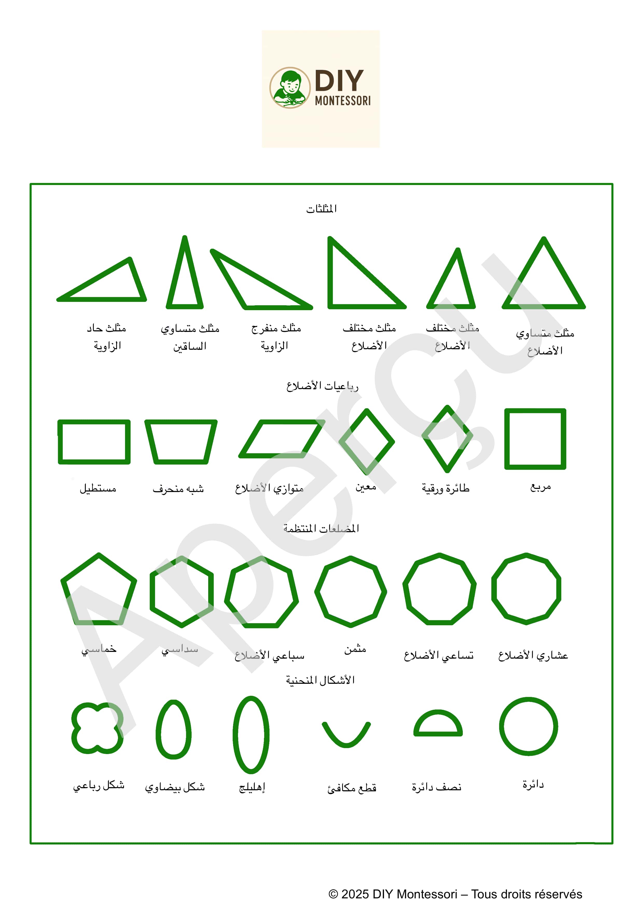 Ce document à imprimer présente, sur une seule page, l’ensemble des formes géométriques essentielles utilisées dans la pédagogie Montessori :