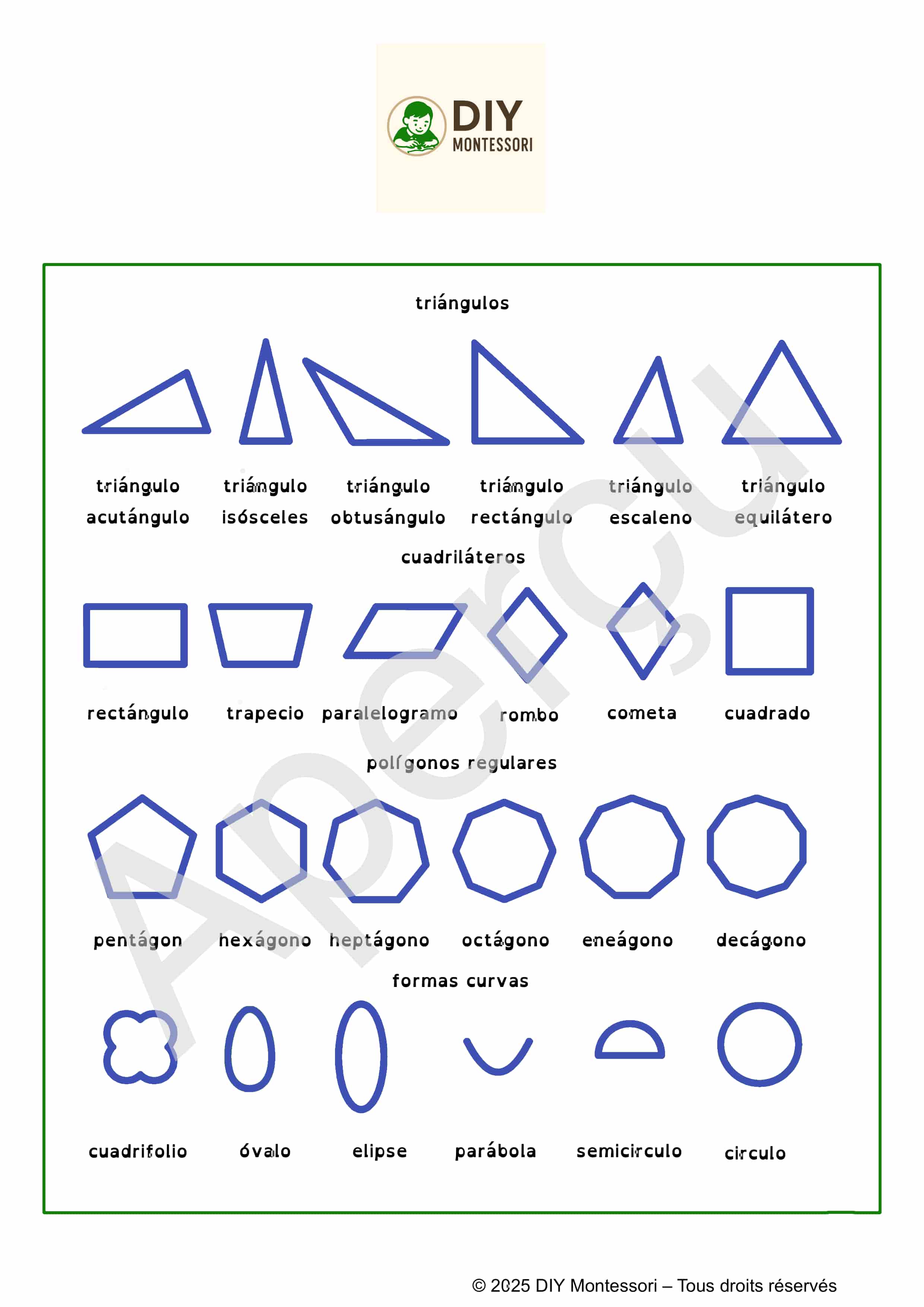Ce document à imprimer présente, sur une seule page, l’ensemble des formes géométriques essentielles utilisées dans la pédagogie Montessori :